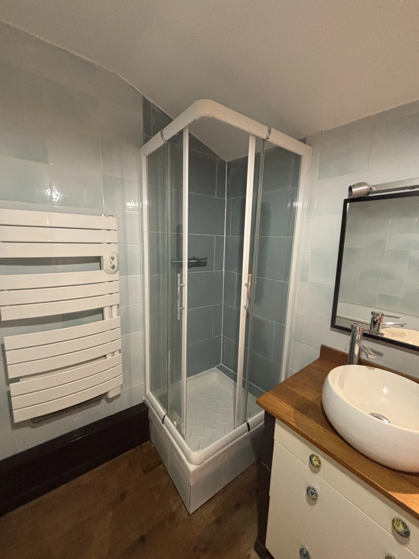 suite à la rénovation de la salle de bain, réalisée par la société MB Renov, un nouveau revêtement de douche a été mise en place. Ses travaux faisaient suite à des infiltrations d'eau constatés derrière le carrelage existant. La société MB RENOV a de nouveau réalisés un chantier conforme aux règles de L'art, garantissant une solution durable et soigner.
